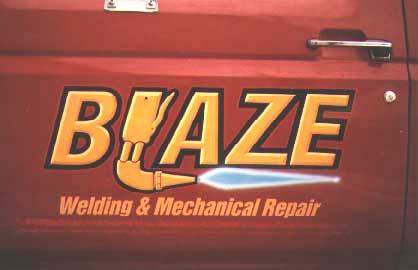 Hand lettered onto truck doors. Lettering & Torch have "Bevelled Edges" for depth and dimension. The owner wanted a torch in his logo (tool of the trade). It was turned upside down and used as a letter.