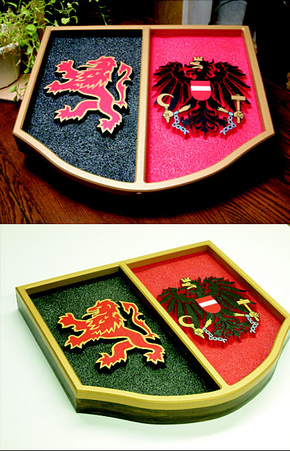 Sandblasted from foam (to give a cast metal look) with mitered edges on face / faux painted woodgrain sides. This is proudly hung over owners' fireplace.