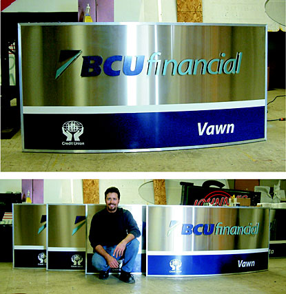 Stainless Steel curved sign with Aluminum Cut-out letters pin mounted to sign. A total of eleven signs were made for "BCU Financial" in Saskatchewan, Canada