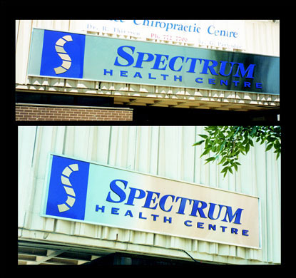 This sign is made from Stainless Steel with cut-out aluminum pin mounted letters painted with Purple Automotive finish / Gold Leafed logo. Main sign size is 5.5' x 30' side signs are 4' x 16'.