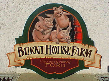This sign is for a pig farmer in England. His farm is called "Burnt House Farm." Look closely to see the smoldering match in the hand of that mischievous pig!