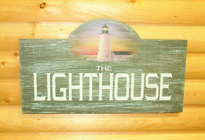 Painted to look weathered, this sign incorporates an historical lighthouse from the area.